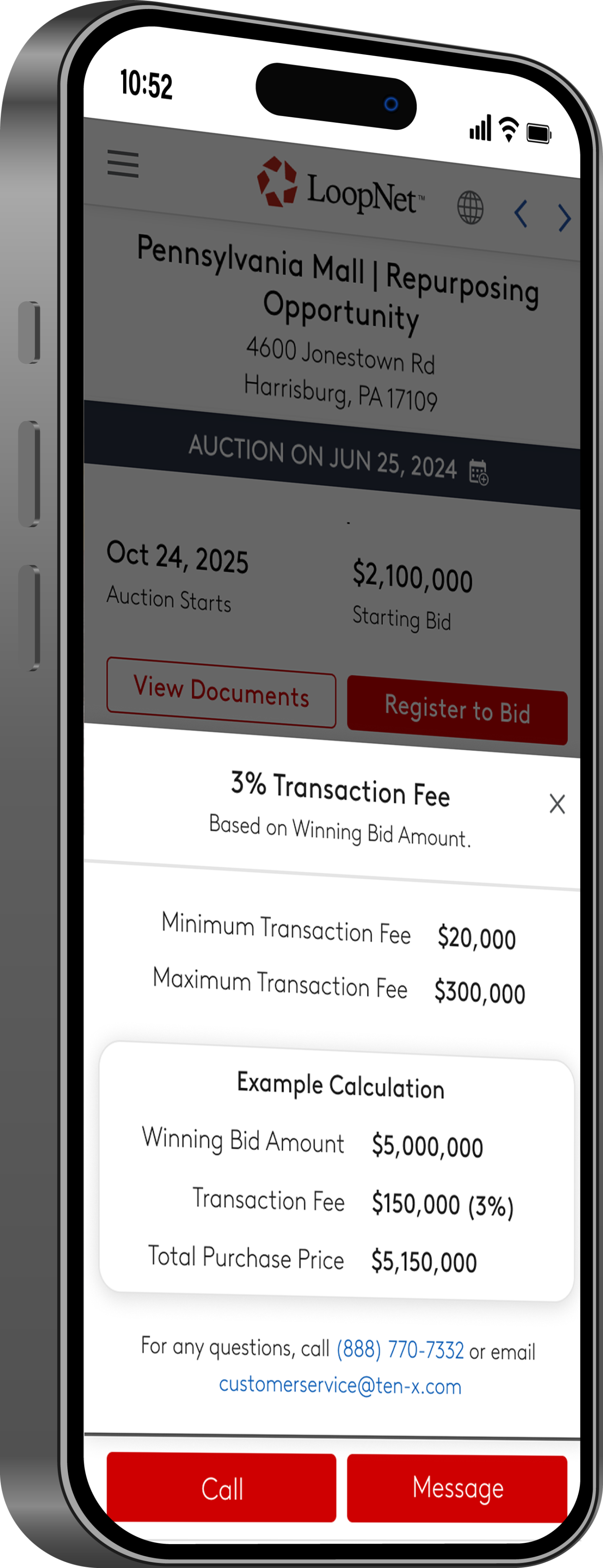 Auctions by Ten-X’s 3% buyer transaction fee sets a new standard in commercial real estate auctions.  Lower fees mean more capital goes toward the asset, not the transaction—driving stronger bidding and better results for sellers and brokers.